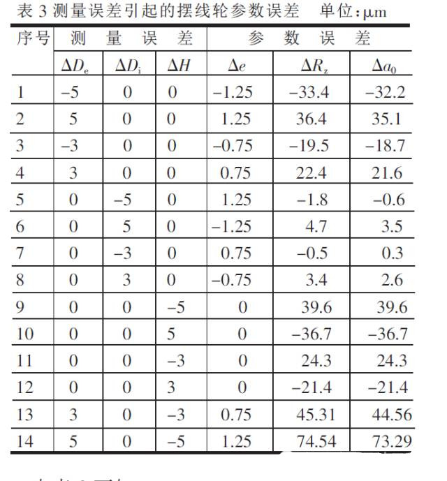 ③序號1一12所列,均為單項測量誤差,若三項均有測量誤差,擺線輪參數誤差變化是復雜的。