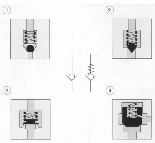 單向閥(止回閥)的主要功能是在一個方向阻止油液的流動,而在反方向則實現(xiàn)自由流動。阻止流動必需無泄漏,因而這類閥總是采用座閥結(jié)構(gòu)。密封元件有鋼球(1),錐閥芯(2),閥座(3)和插裝閥(4)幾種類型。只需很小的液壓力,密封元件就可克服彈簧力而開啟閥門。圖1表示這一基本原理。